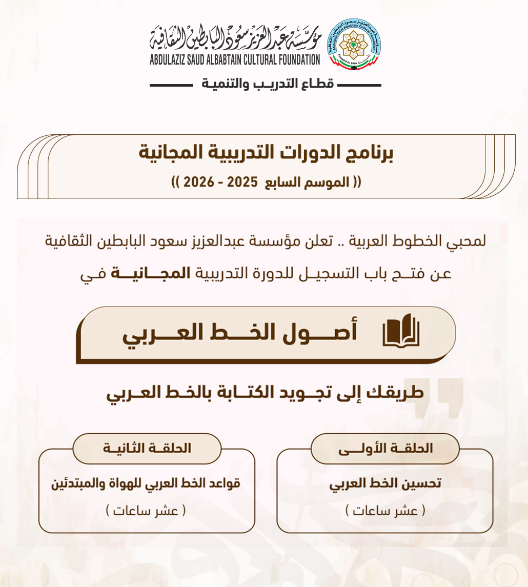 تهدف الدورة إلى تنمية مهارات الكتابة وتحسين الأداء في الخط العربي، من خلال محتوى تدريبي متخصص.